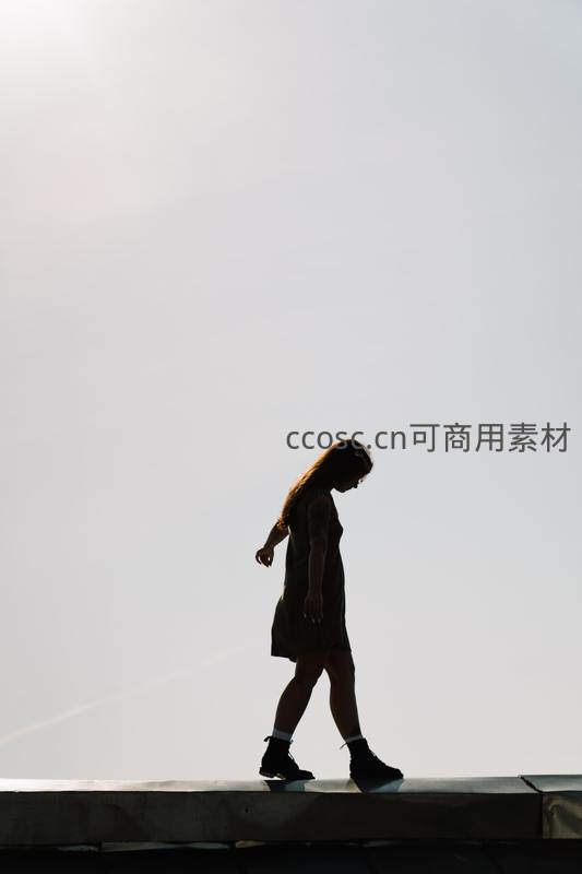 一位女子的剪影独自走在高楼的边缘,背景是无垠的灰白色天空,画面传递出一种都市中的孤独感与内心的沉静思索。