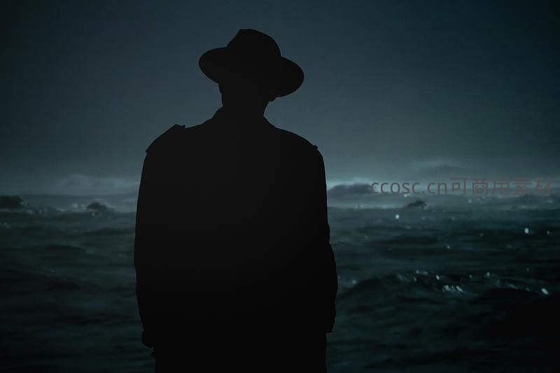 一位戴着宽檐帽的剪影伫立在波涛汹涌的海边,夜色深沉,海风呼啸,仿佛在与无垠的大海进行一场无声的对话。