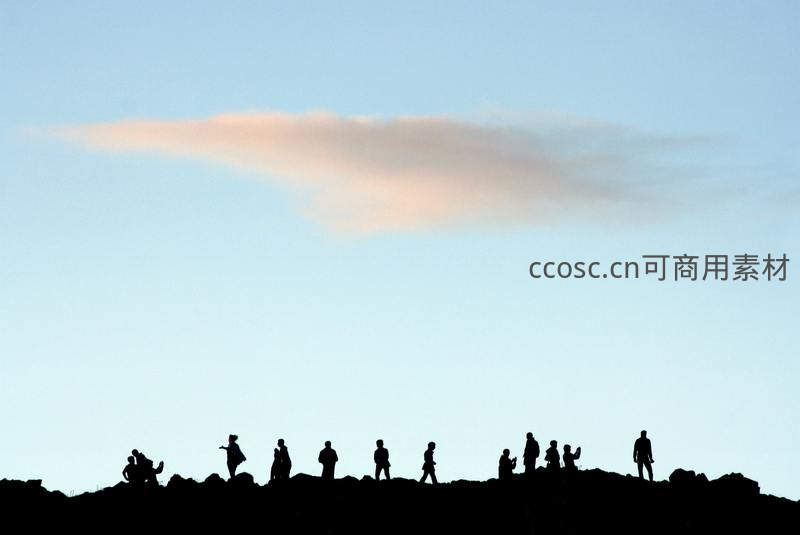 一群人的黑色剪影伫立在山脊线上,背景是淡蓝色的天空和一抹柔和的云霞,营造出宁静而壮阔的氛围。