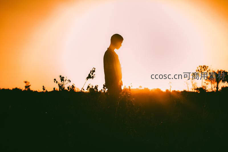 一个少年独自站在田野间,背对镜头,沐浴在温暖的落日余晖中,四周植被朦胧,画面充满诗意与宁静感。