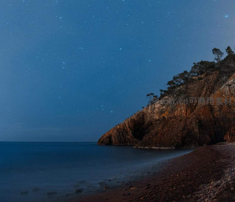 深蓝夜空繁星点点,海岸悬崖轮廓分明,海浪轻拍沙滩,营造出宁静而神秘的自然氛围。
