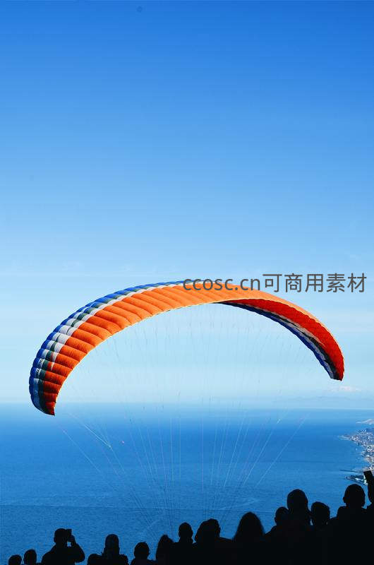 一顶色彩鲜艳的滑翔伞在无垠的碧海蓝天间自由翱翔,下方是仰望的人群剪影和蜿蜒的海岸线,展现了极限运动带来的自由与刺激,以及人与自然的和谐共舞。