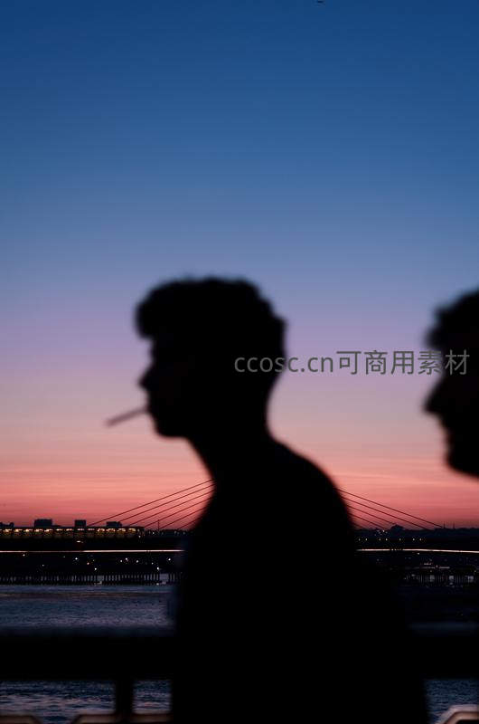 暮色中,人物剪影伫立江边,远处斜拉桥轮廓清晰,天空由蓝渐变至粉紫,水面波光粼粼,营造出静谧而富有诗意的都市黄昏氛围。