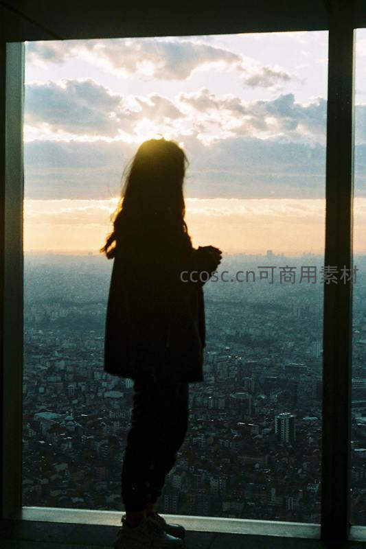 少女伫立摩天楼窗前,背对镜头凝视脚下绵延的城市与天边绚烂晚霞,云层被阳光穿透,形成温暖光晕,表达都市中的孤独与壮阔视野。