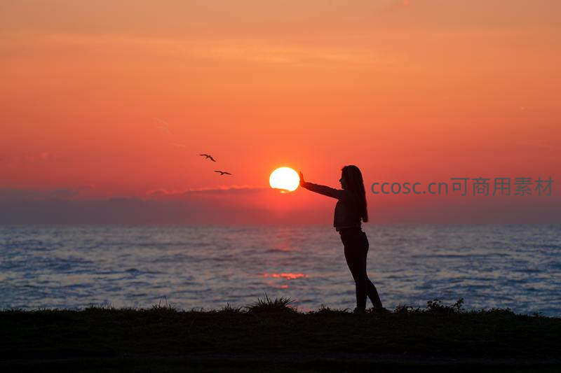 一位女孩站在海边悬崖,伸出手仿佛要抓住即将沉入海平线的太阳,背景是绚烂的橙红天空和飞过的海鸟。
