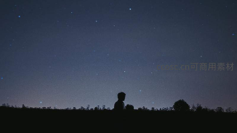 一人独自伫立在黑暗原野上,仰望着布满星辰的深邃夜空,身影渺小却充满对宇宙的敬畏与思索。