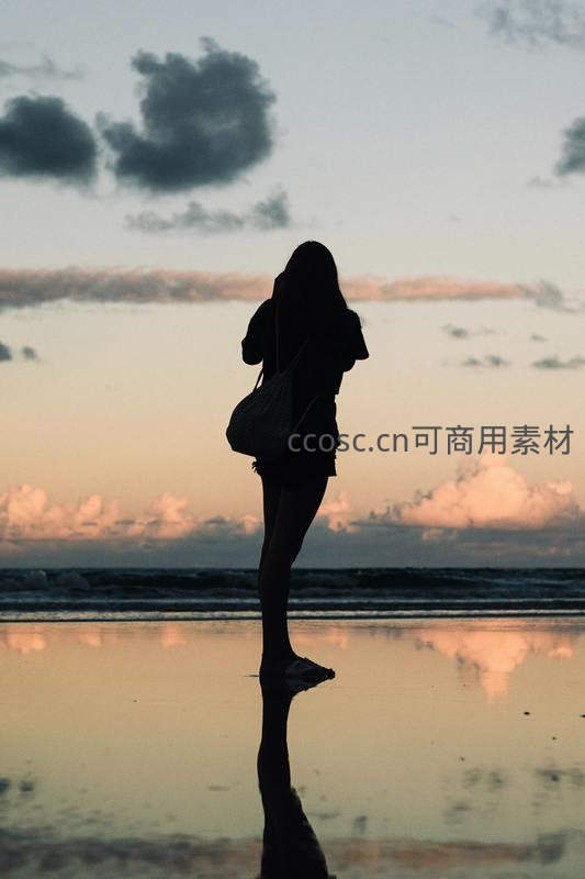 一位女子独自伫立在湿润沙滩上,身后是渐变的暮色天空与翻涌海浪,水面上倒影拉长,诉说着宁静与沉思。