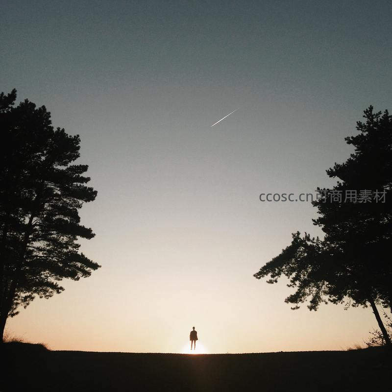 一人独自站立在山丘顶端,两侧松树如剪影般矗立,天空中一道流星划过,暮色温柔,营造出静谧、思索与宇宙浩瀚交织的意境。