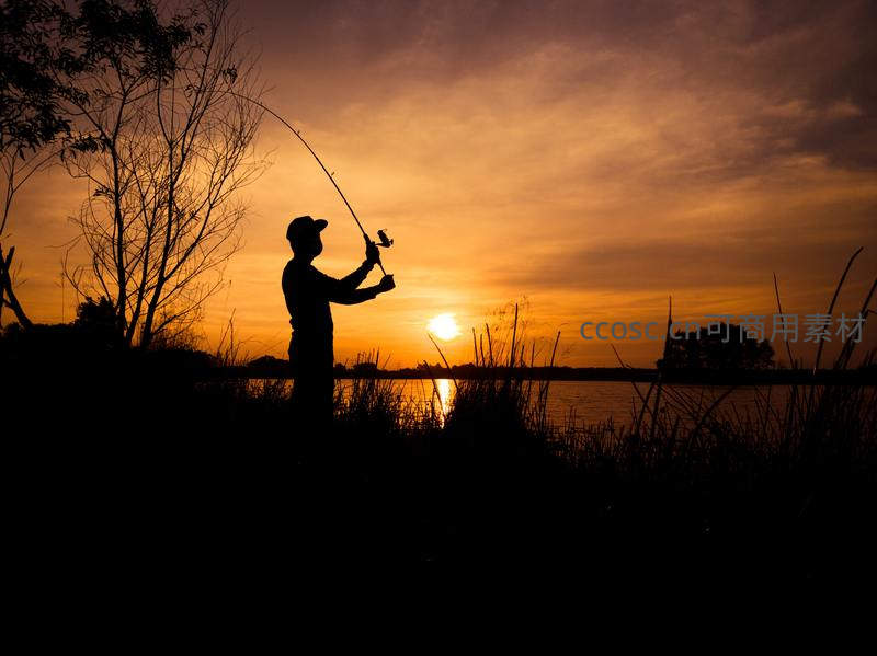 湖畔垂钓者的黄昏剪影