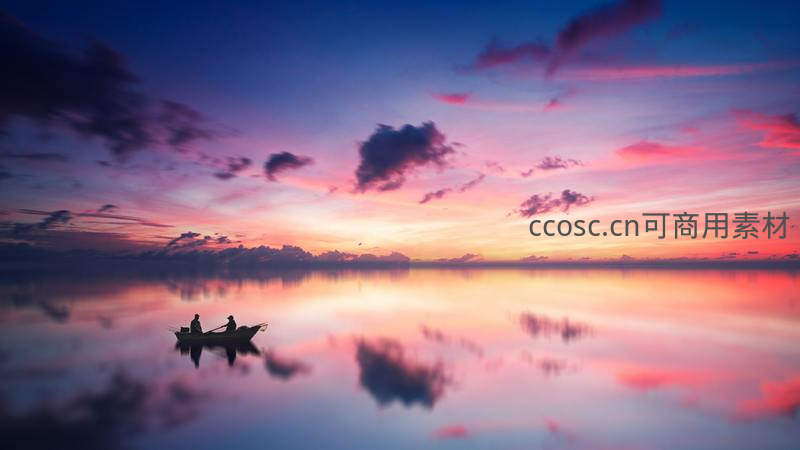 天空被梦幻般的粉紫色晚霞铺满,平静无波的水面如巨大画布,完美复制了天空的绚烂色彩。一叶孤舟与船上人影静静停泊,天地交融,营造出超凡脱俗的宁静意境。