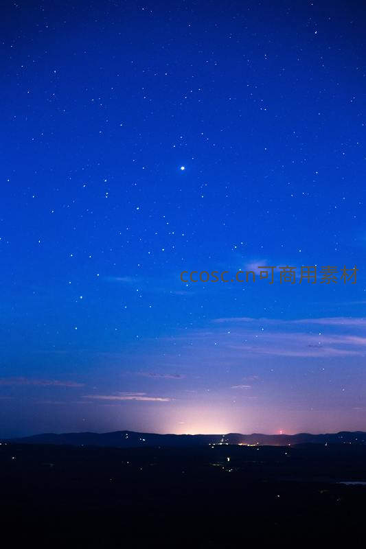 深蓝色的夜空中繁星闪烁,远方城市灯火微明,山峦轮廓清晰,宁静而辽阔。