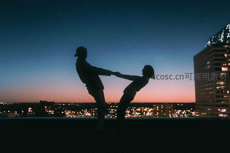 夜幕降临,一对情侣在高楼天台相拥起舞,身后是万家灯火的城市与点点繁星。剪影勾勒出亲密互动,营造都市中的梦幻浪漫氛围。