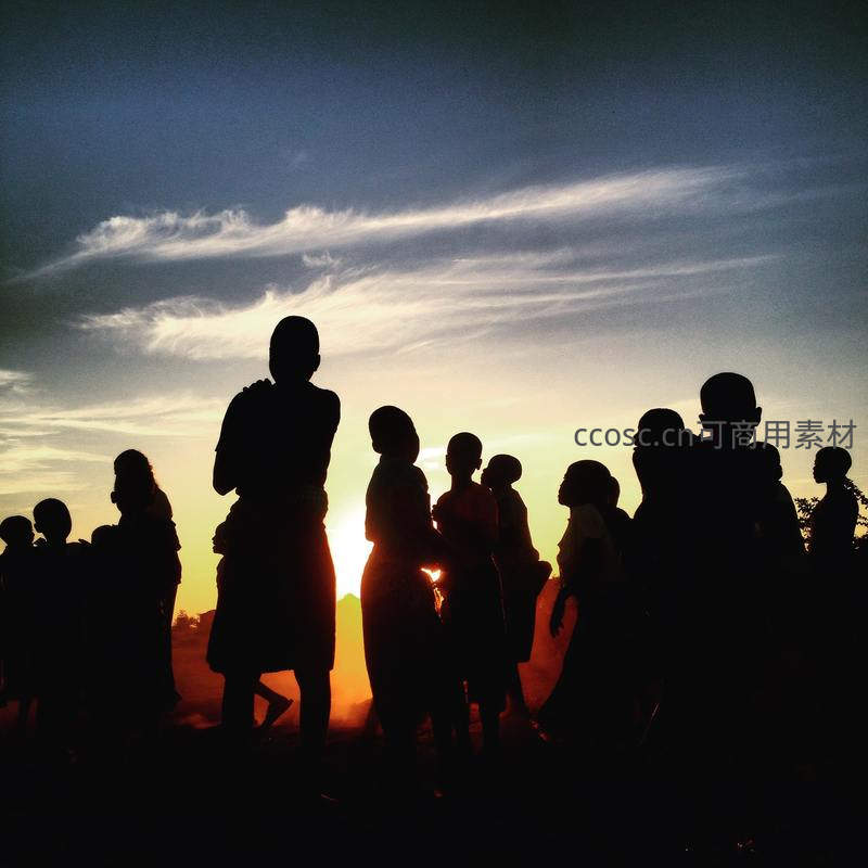 在绚烂的夕阳背景下,一群人静立凝望,轮廓分明,氛围温馨祥和,仿佛时间在此刻静止。