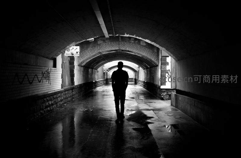 在一条潮湿阴暗的拱形隧道中,一个孤独的身影背对镜头走向远方的光亮。黑白的色调和湿漉漉的地面倒影,强化了画面的戏剧性和孤寂感。