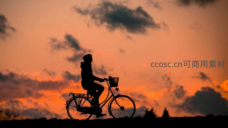 在绚烂的橙红色晚霞映衬下,一位骑着自行车的人化为黑色剪影,享受着惬意的户外时光,充满诗意与自由感。