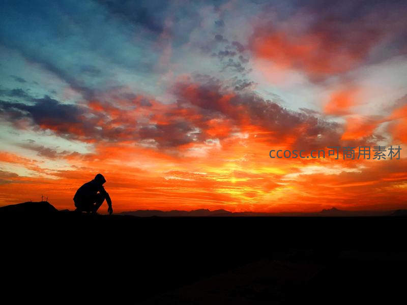 一人蹲坐于荒凉地平线前,身后是燃烧般的橙红晚霞与深蓝云层,构成一幅充满诗意与哲思的自然画卷。