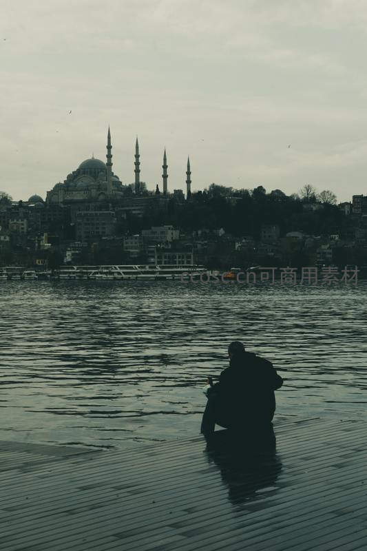 一人静坐于水边木栈道,远眺对岸宏伟的清真寺与密集民居,在灰蒙天色下,画面弥漫着浓厚的文化与宁静氛围。