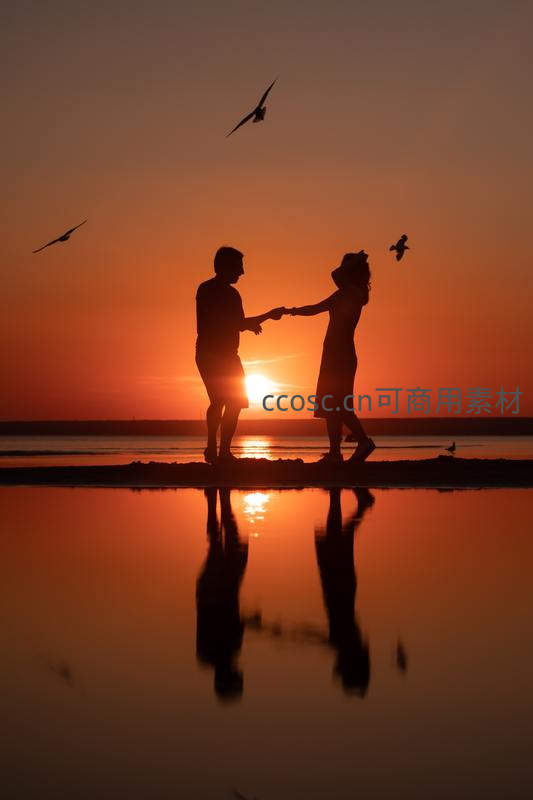 一对情侣在火红的落日余晖下于水边相拥,他们的身影与飞鸟一同倒映在平静水面,构成一幅浪漫的画卷。