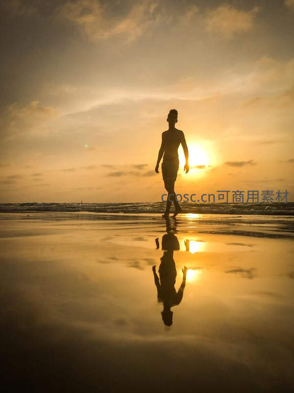 一人独自在湿润沙滩上行走,夕阳将身影拉长并映在水面,形成完美对称倒影,营造出静谧、沉思的氛围。