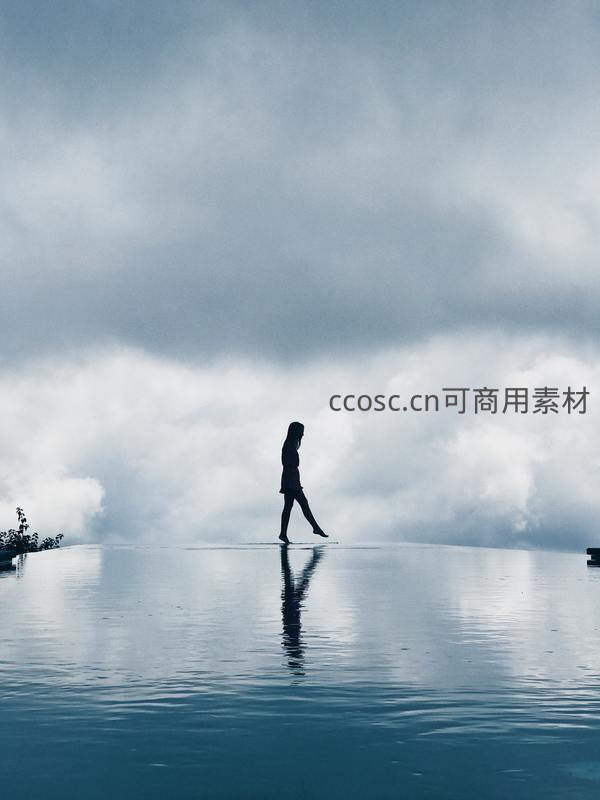 一位女子在无边泳池边缘缓步前行,脚下是翻涌云海,天空灰蓝,整体画面空灵静谧,仿佛置身仙境或高端度假胜地。