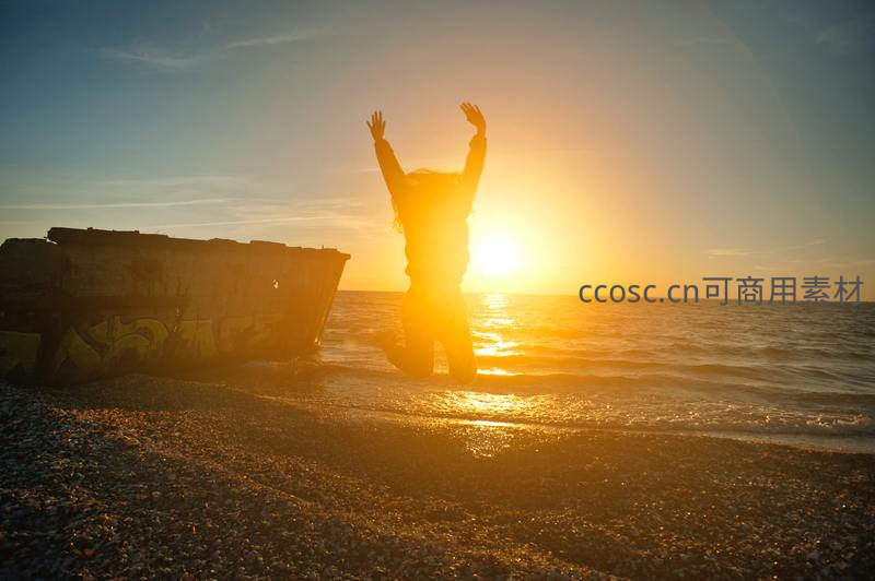 一个人在金色夕阳下的海滩上尽情跳跃,背景是波光粼粼的大海和沉船残骸,充满自由与活力的氛围。