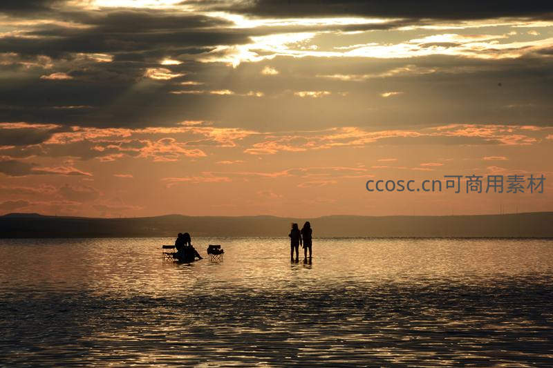 两人站在湖中享受黄昏美景,远处云层透出金色光芒,水面波光粼粼,旁边小桌椅暗示轻松聚会,氛围惬意浪漫。