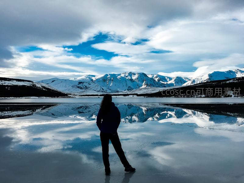 一人伫立在结冰的湖面上,远眺连绵的雪山,天空云彩与山峦在冰面形成完美倒影,营造出空灵而壮阔的视觉奇观。