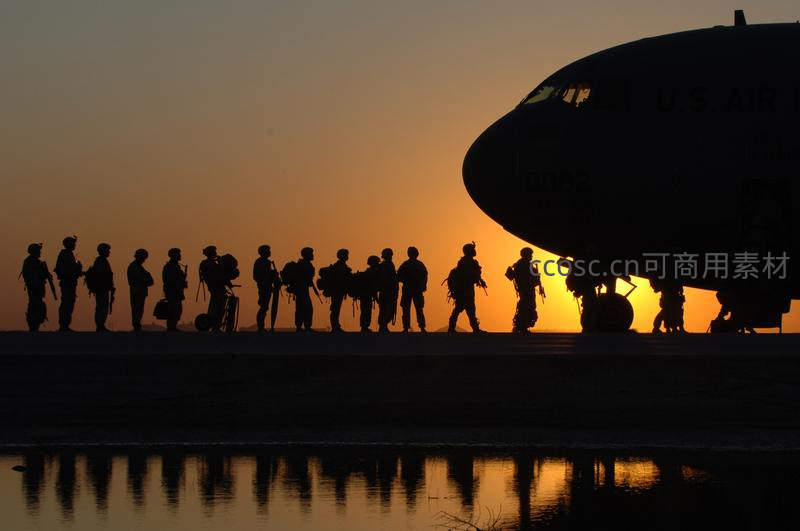 夕阳西下,一队全副武装的士兵整齐列队走向大型运输机,地面水洼倒映着他们的身影,展现出庄严、肃穆与即将奔赴使命的坚定感。