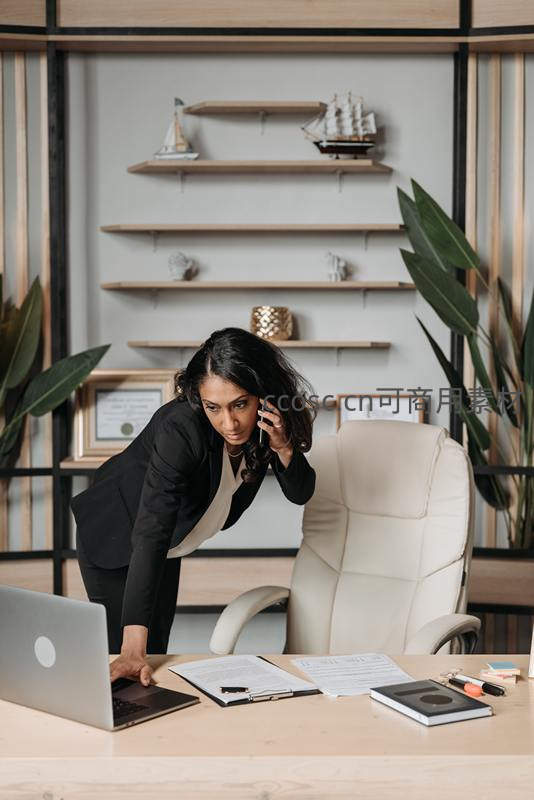 一位身着黑色西装的女高管正俯身于办公桌前,一手接听电话,一手操作电脑,展现出高效专业的职场形象。