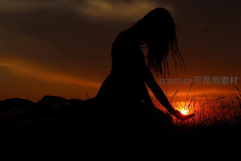在绚烂的黄昏背景下,一位长发女子俯身于草丛中,手掌轻托着落日的光辉,其优雅姿态与温暖色调共同构成一幅充满诗意的画面。