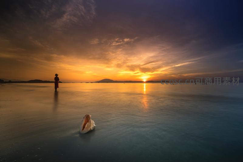 海边孤影伴落日,贝壳静卧潮间