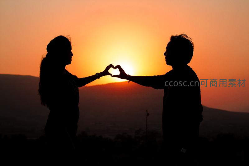 一对恋人在落日余晖中相对而立,双手共同比出心形轮廓,温暖的阳光穿透指缝,象征着永恒的爱意与美好的瞬间。