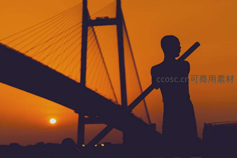 一名工人的剪影在宏伟斜拉桥前显得渺小却坚韧,肩扛工具望向远方,夕阳将整个场景染成金橙色,致敬城市建设者。