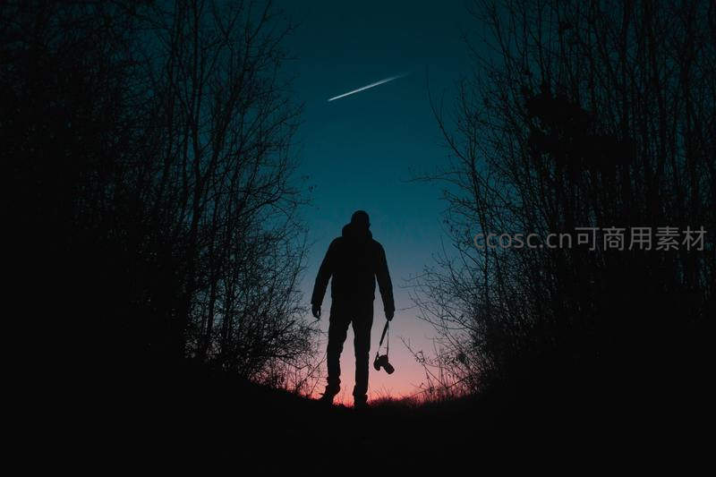 一人独自站在林间小径上,仰望天际划过的流星,手中握着相机,背景是深蓝与粉红交织的暮色,充满诗意与遐想。