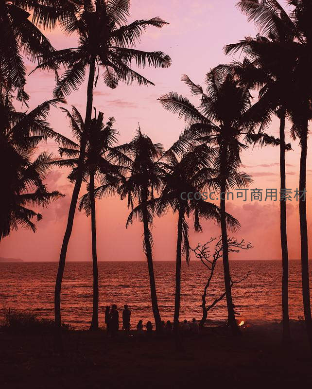 高大的椰子树在瑰丽晚霞中化作黑色剪影,树下人们或站或坐,共同欣赏着海平面上沉落的太阳,享受悠闲假日时光。