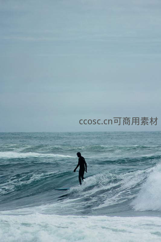 一名冲浪者身着黑衣,在翻涌的海浪上保持平衡,背景是辽阔无垠的灰蓝大海,展现出人与自然搏斗的勇气与力量。