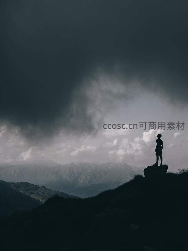 一人独自站立在高山之巅的岩石上,身影被黑暗笼罩,背后是翻滚的厚重乌云和远处连绵的山脉,画面充满戏剧张力与自然的磅礴气势。