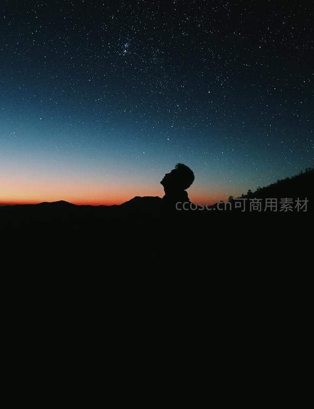 一个人的剪影静静仰望着布满繁星的深邃夜空,地平线处残留着日落的余晖,仿佛在与浩瀚宇宙对话,感受自然的壮丽与自身的渺小。