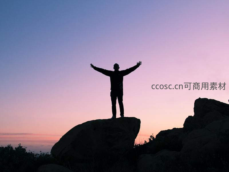 一人站在山巅巨石上,双臂张开拥抱粉紫渐变的黄昏天空,姿态充满力量与释放感,象征着征服、自由和对广阔世界的无限向往。