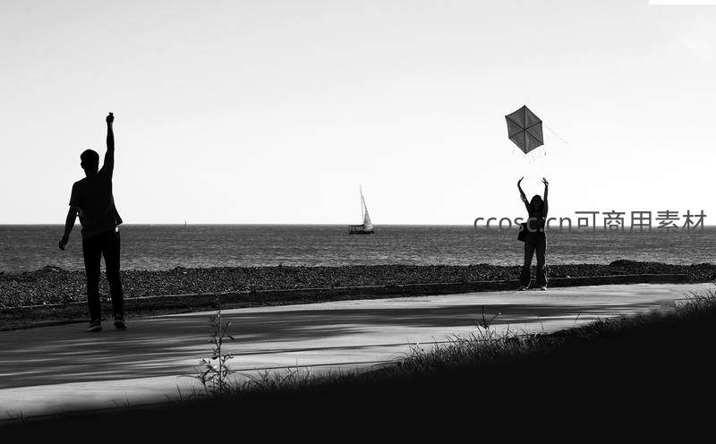 一对情侣在海边步道上放飞风筝,远处帆船点点,黑白影像捕捉了宁静与自由的瞬间,充满诗意与浪漫。