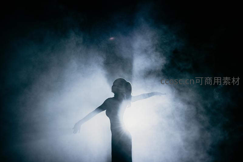 在幽蓝冷光与缭绕烟雾中,舞者身姿轻盈舒展,宛如仙境中的精灵,充满神秘与诗意的视觉冲击。