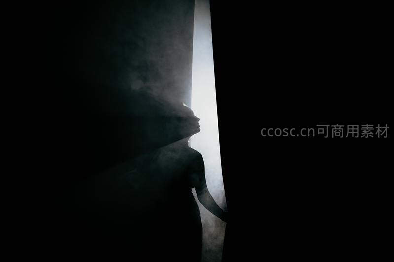 女子侧脸剪影倚靠在一道窄光旁,烟雾环绕,神情宁静专注,营造出沉思与内省的深邃艺术意境。