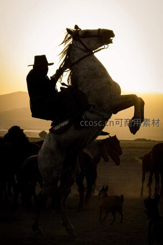 夕阳西下,一位牧人驾驭着扬蹄嘶鸣的骏马,身后是奔腾的牛群,整个场景充满原始的力量感与西部风情的粗犷之美。