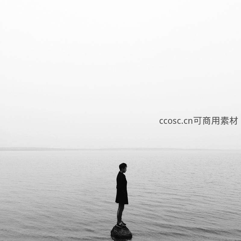 一人独自站在海中岩石上,背对镜头凝望远方,水面平静无波,天空空旷,营造出深沉的孤独与沉思氛围。