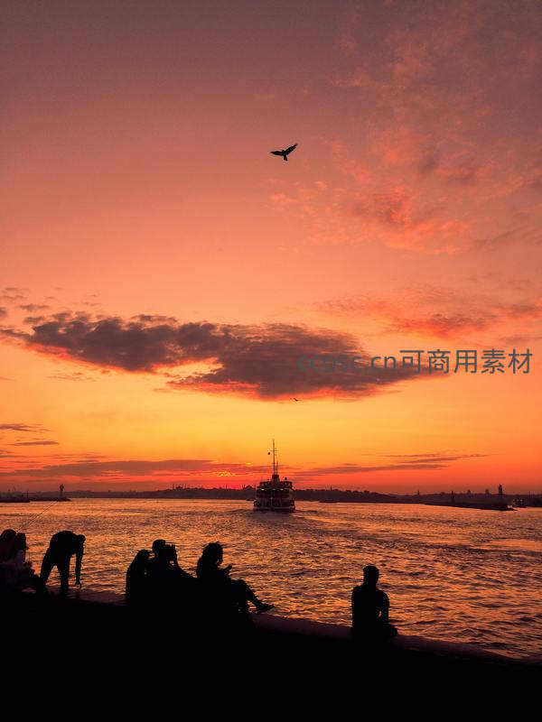 绚烂晚霞映红江面,游人静坐岸边观赏,远处轮船缓缓行驶,一只飞鸟划过天际,构成一幅温暖而富有诗意的城市黄昏图景。