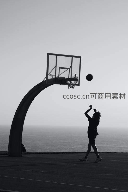 海边篮球场上的剪影投篮瞬间