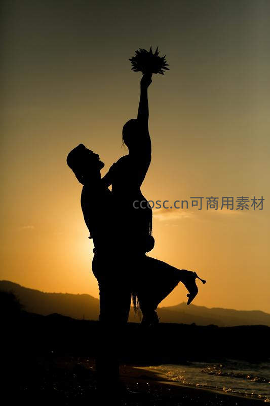 金色夕阳下,男子将女子高高托起,她手举花束,两人剪影定格于海天之间,充满爱意与诗意。