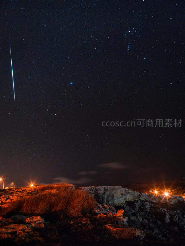 一道明亮的流星划破漆黑夜空,下方是崎岖的岩石海岸,远处城市灯火闪烁,形成天地间的奇妙对比。