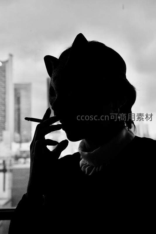 在黑白光影的映衬下,一位戴着猫耳面具的人侧身倚窗,指尖夹着香烟,姿态慵懒而神秘。窗外是模糊的城市轮廓,更添一丝疏离与故事感。
