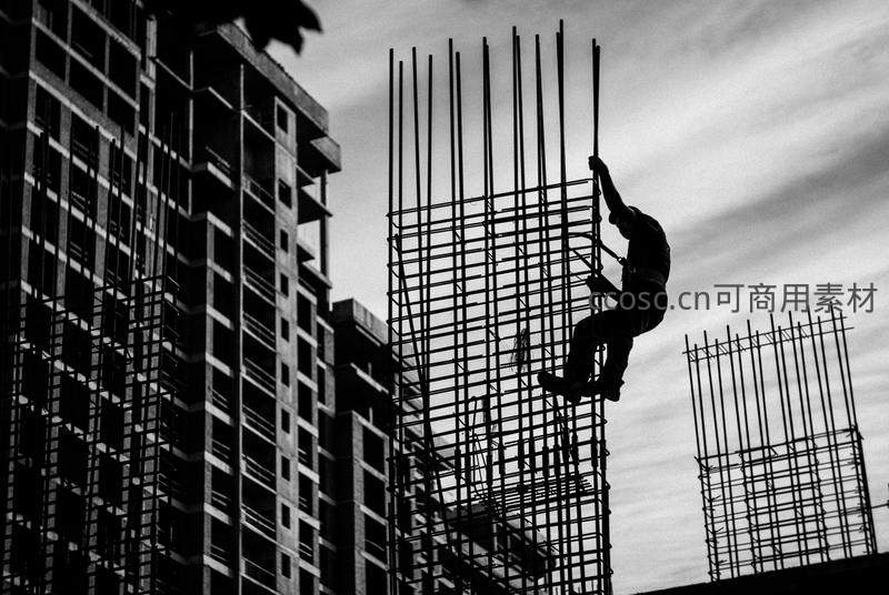 一名建筑工人在高楼框架上进行高空作业,身体与钢筋构成强烈视觉对比,展现城市建设的艰辛与力量。